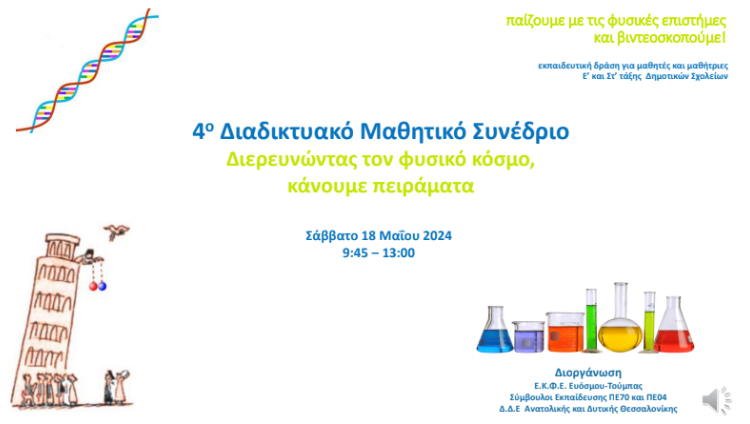 Το Σάββατο 18 Μαΐου 2024 πραγματοποιήθηκε το 4ο διαδικτυακό μαθητικό συνέδριο με τίτλο:“Διερευνώντας τον φυσικό κόσμο, κάνουμε πειράματα”,